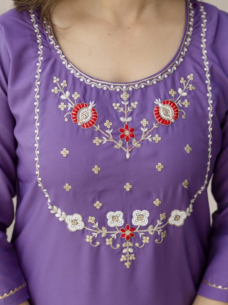 Kurti = Stitched Kurti Material = ViscoseWork = EmbroideredBottom = StitchedBottom Material = ViscoseDupatta = StitchedDupatta Material = JacquardDupatta Length = 2.10 Meter