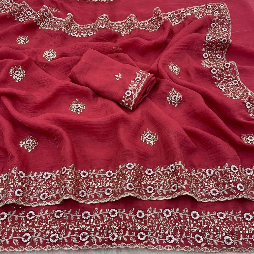Saree:- Very Soft & Elegant Rich Look Tissue Sonic Crush Fabric With Beautiful Embroidery 3+5(Dual) Mm Sequence Work Heavy Border With Buttis In All Over Saree Aarco