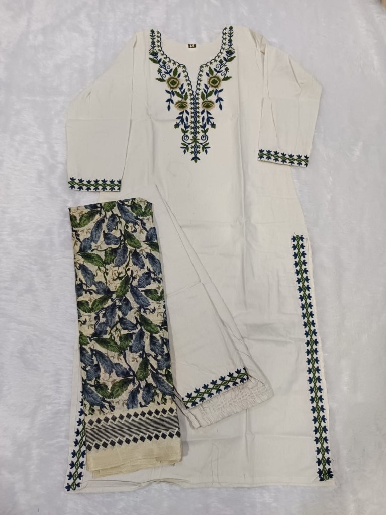 Kurti :- Khadi Cotton With Beautiful Embroidery Pent :- Khadi CottonDupatta :- Bhagalpuri Khadi Print Dupatta (2.25 Mtr)Inner :- CottonSingle Available
